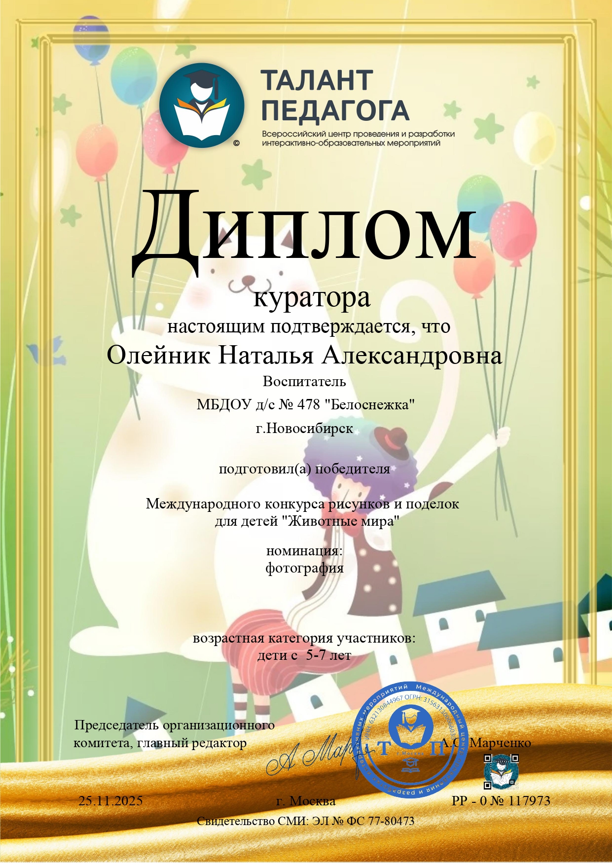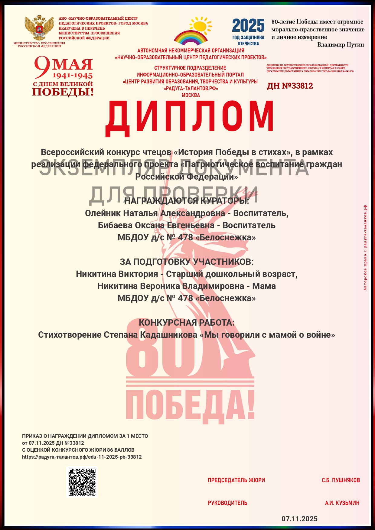 Диплом куратора Всероссийского конкурса чтецов «История Победы в стихах», в рамках реализации федерального проекта «Патриотическое воспитание граждан Российской Федерации»ЗА ПОДГОТОВКУ УЧАСТНИКОВ: Калиновский Марк Дмитриевич - Старший дошкольный возраст, Аксёнова Полина Сергеевна - Сестра, МБДОУ д/с № 478 «Белоснежка», КОНКУРСНАЯ РАБОТА: Стихотворение Роберта Рождественского «Огромное небо», 07.11.2025 г.