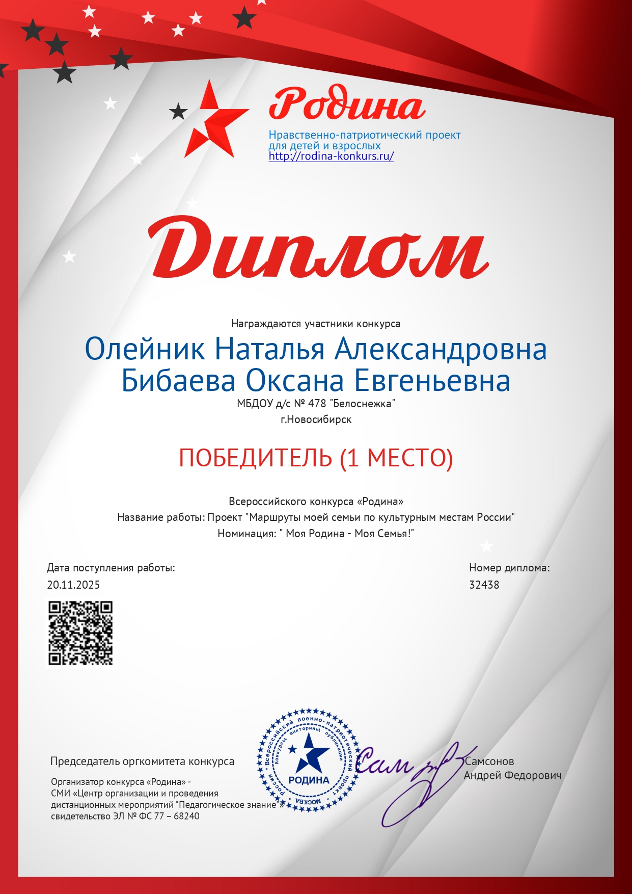 Диплом победителей 1 место Всероссийского конкурса "Родина", название работы: Проект "Маршруты моей семьи по культурным местам России", Номинация: " Моя Родина - Моя Семья!" 20.11.2025 г.